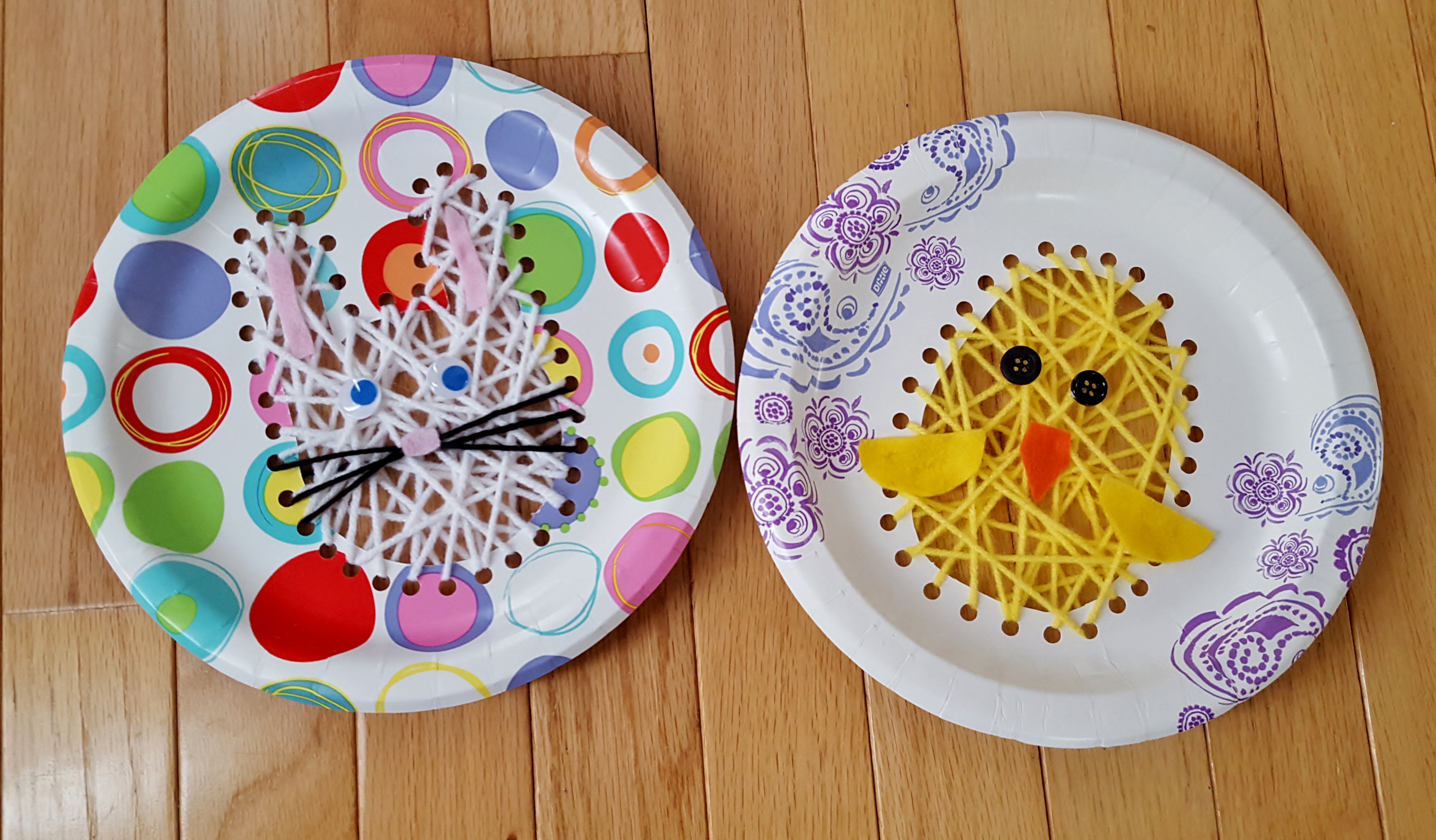 Start by tracing out your design on the back of the plate. The chick is egg shaped. For the bunny I traced a circle and then drew ears on top. Once your design is drawn, cut it out by poking your scissors into the center of the design and cutting out your shape, or use your craft knife. The craft knife is easier for the extra detail of the bunny. With either method just be mindful of your work surface or where your fingers are. (Always remember to place something underneath when cutting with a craft knife so you don’t damage your work surface.) Next, use your hole punch to make evenly spaced holes around your design trying to keep at least an eighth of an inch between the hole and the edge (I didn’t on one and it ripped, if this happens to you just pull the yarn to the back of the plate and tape it near the torn hole). Last thing to prepare is the yarn. Did you know that from the tip of your nose to the end of your fingers when your arm is stretched out to your side is roughly one yard? Do that about 4 times and you should have enough yarn! If you are using a lager plate or want the yarn filled in thicker use more. Wrap tape around one end like a shoe lace and you are ready to start.
